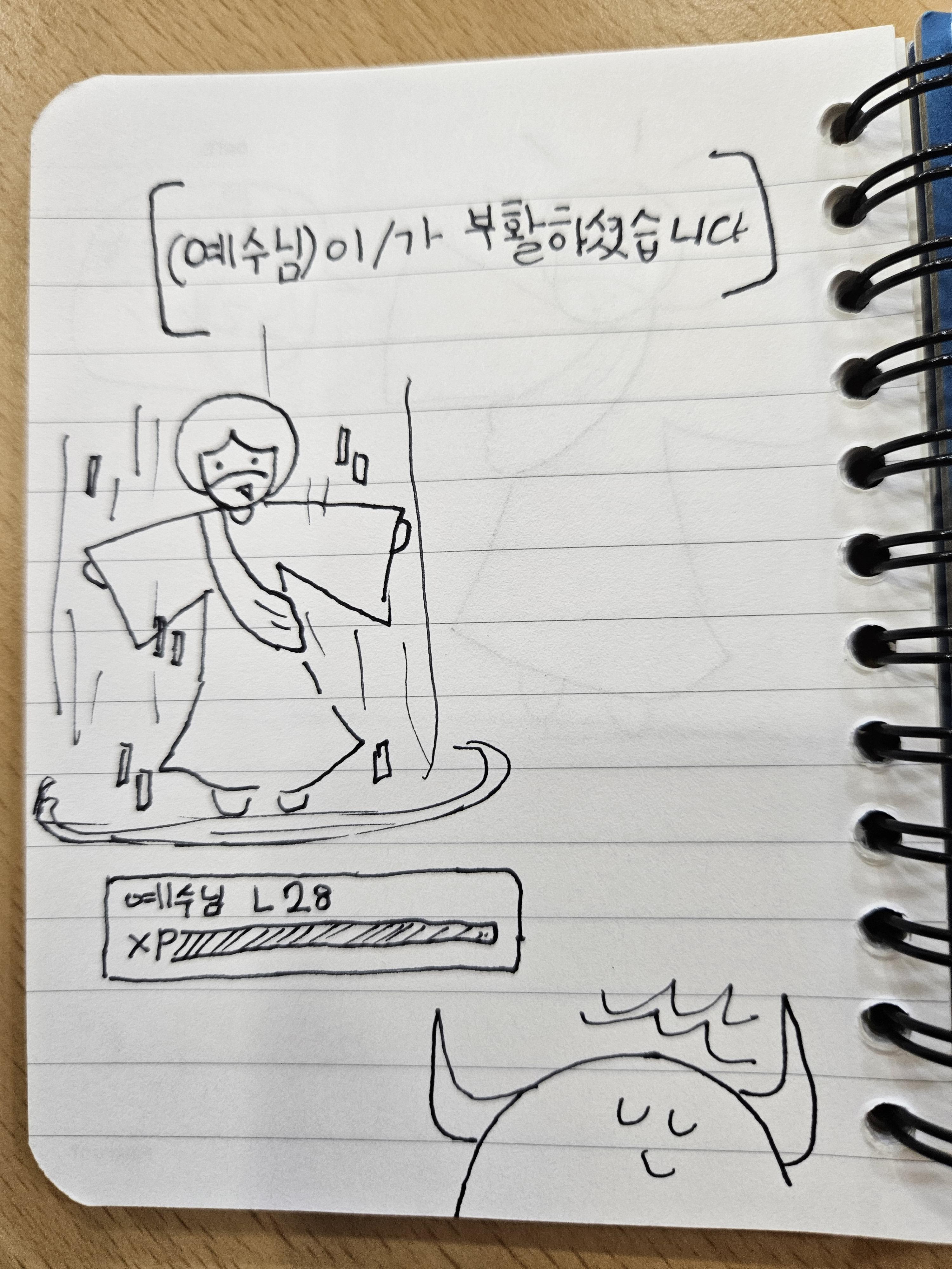 예배 시간에 딸이 그린 그림입니다. 예수님이 게임 캐릭터가 되셨습니다. ^^;;;
