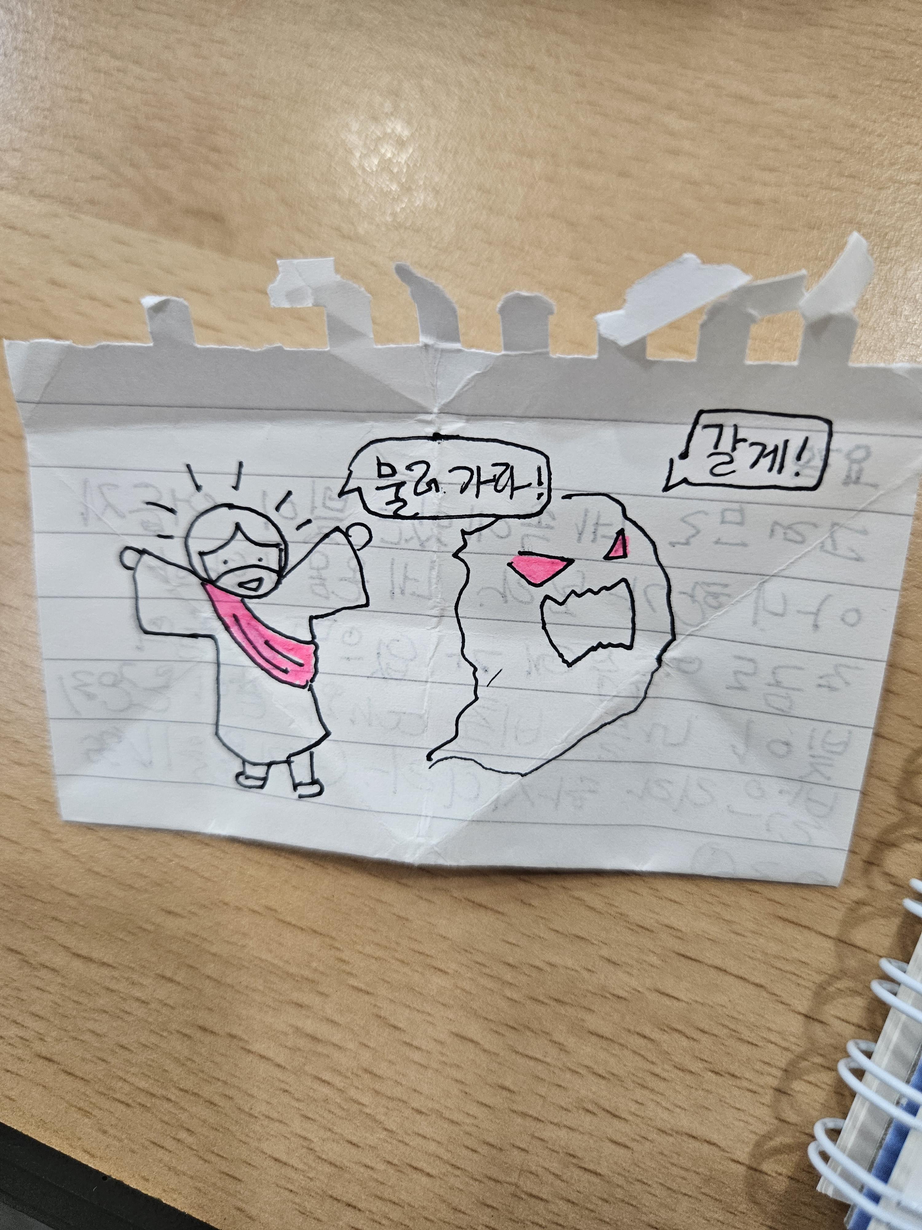 어떡하나 고민하다가 아이가 그림 그리는 걸 좋아하니, 설교 들으며 그림을 그리라고 수첩을 뜯어주었습니다.