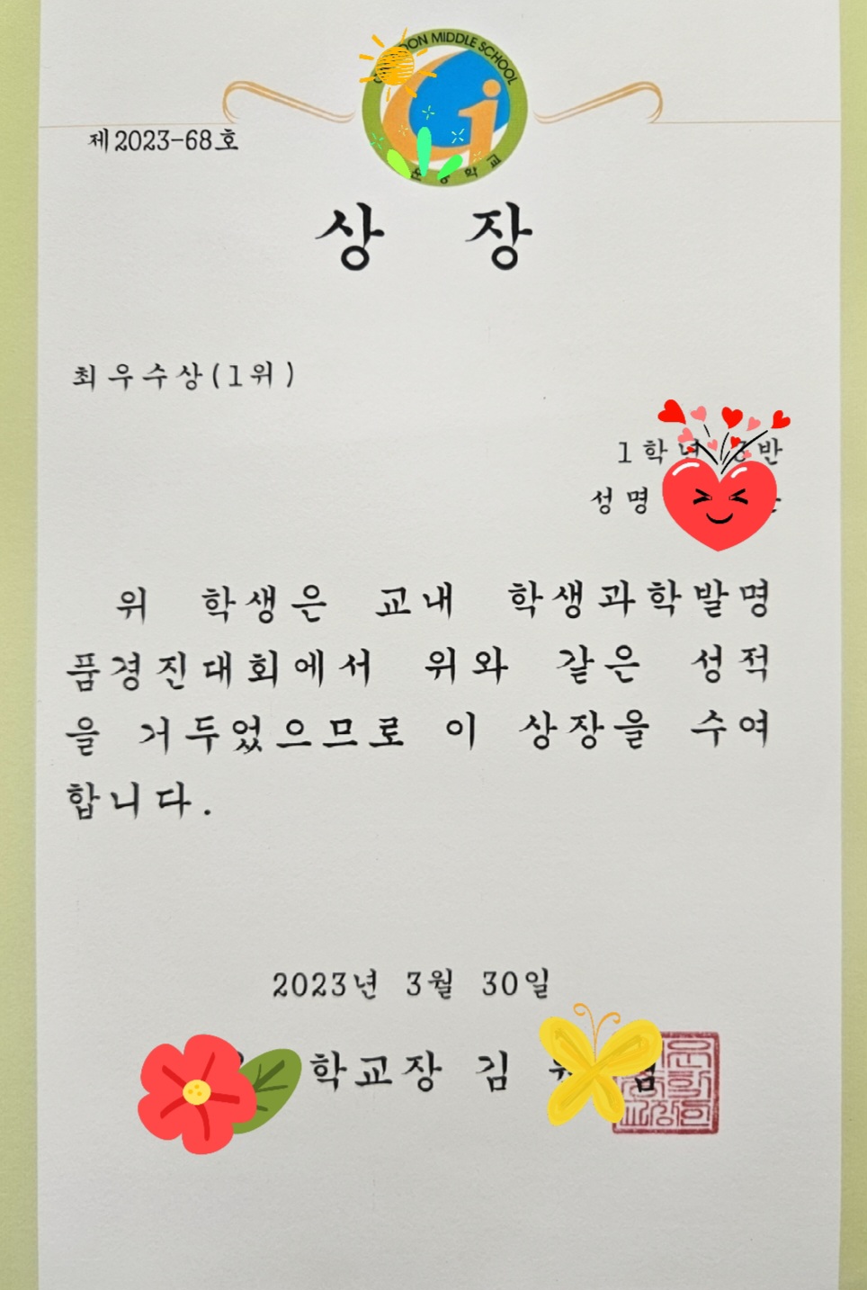 자기는 그냥 과학숙제를 했는데 1등을 했다고 합니다. 상 받은 것보다 교장실에 가본 걸 더 흥미있어 하더군요.