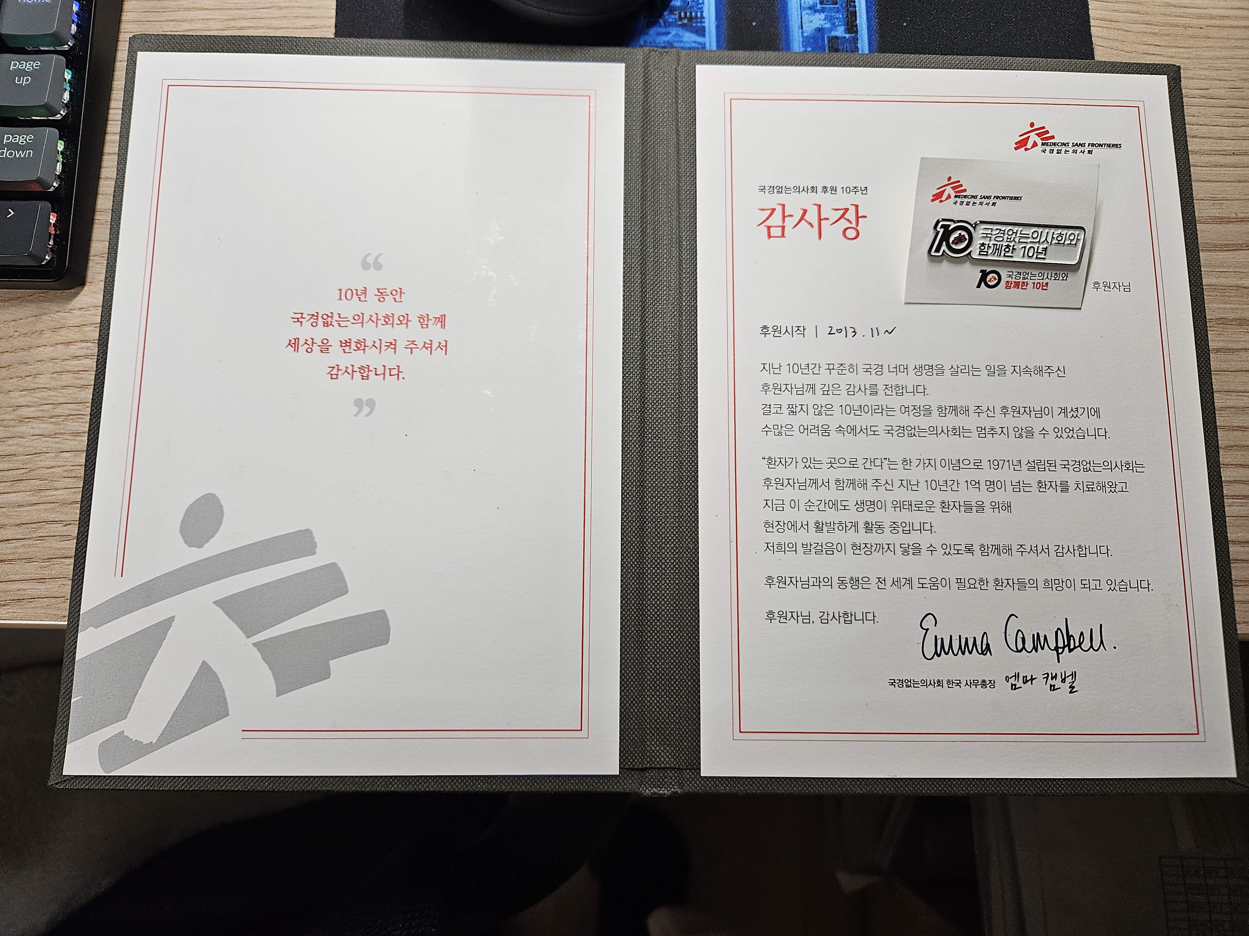 그런데 그저께 제가 후원한 지 10년이 되었다며 감사장을 보내주셨습니다. 너무 적은 액수라 어디에 말하기도 뻘쭘한데, 이리 감사장까지 보내주시니 감개가 무량하였습니다.