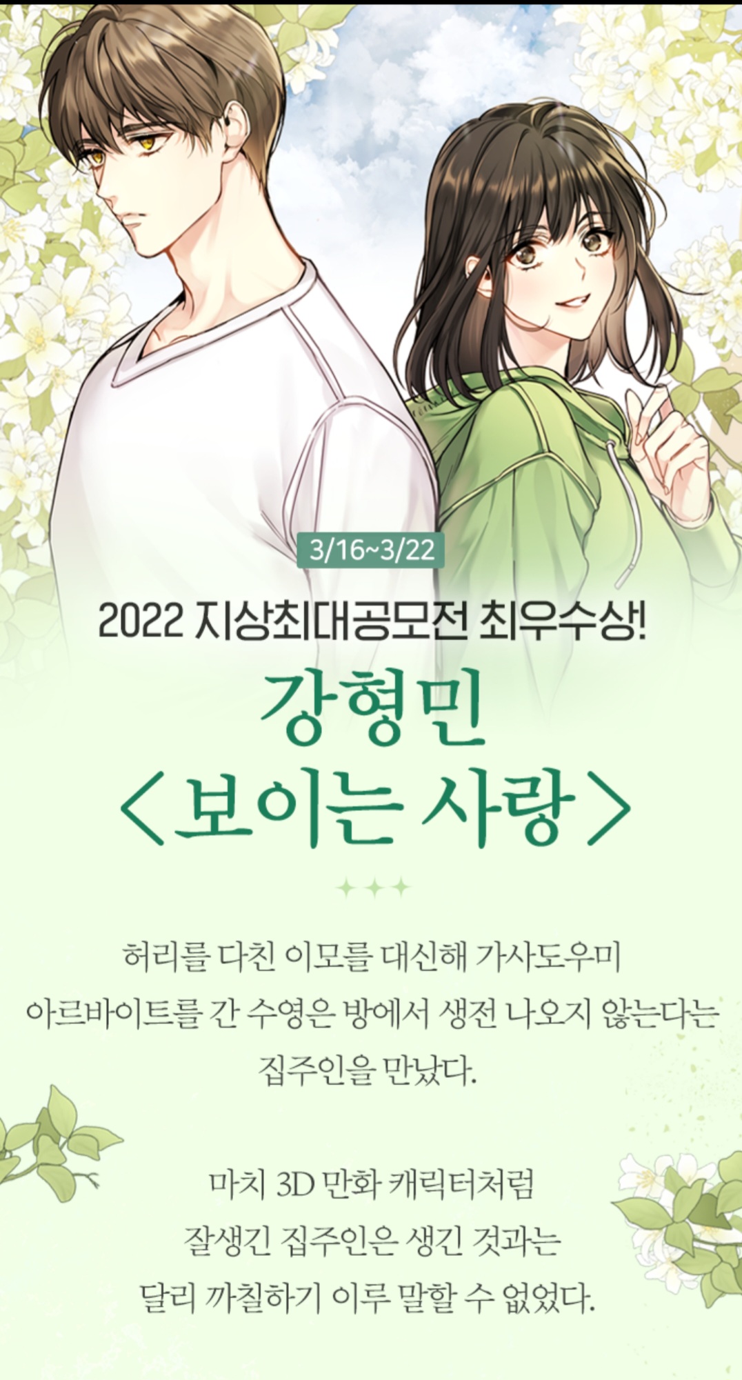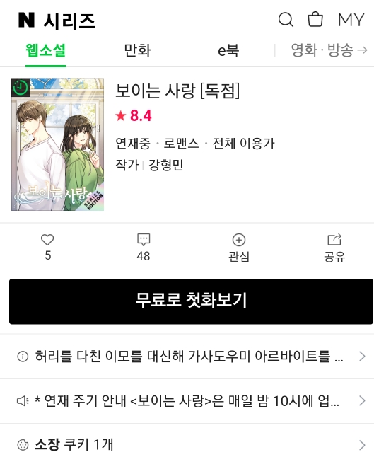 그 '시리즈' 누르고 들어오셔서 <보이는 사랑> 검색해서 보시면 된답니다.